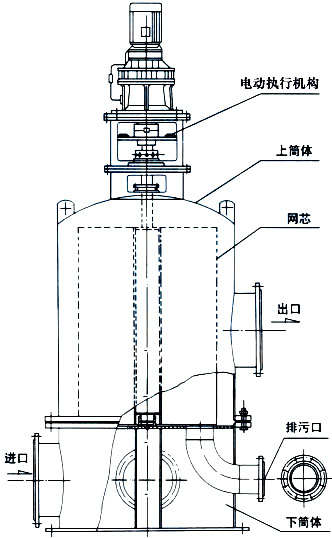 系列旋轉反沖洗濾水器與管道系統連接后,水從進水口進入濾水器內,過濾后的水從出水口流出,當水中雜質通過網芯時,由于體積大于網芯孔,而被截留在網芯上,當聚集到一定數量時,即造成進水口和出水口有一定壓差,這時可轉動網芯進行輪次反沖洗,手動或電器控制打開排污閥門排出雜質。