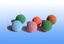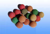 ·普通膠球 普通膠球表面光滑,主要用于可再剝皮磨打后制成標準剝皮膠球,一些發電廠因管道無較硬沉積才定購光膠球,一般用于不銹鋼管。但對銅管使用的效果不佳。 主要用于去除軟性污垢,適用于冷卻水應用場合,淤泥、粘泥、泥砂等,適用于銅管換熱器。 ·金剛砂膠球 金剛砂膠球分為全金剛砂膠球和半金剛砂膠球兩種。金剛砂膠球適用于清除各種結垢沉積較多的管道,但對管子有傷害,一般不長期使用,特別銅管更慎用。 有效去除硬質結垢,如:碳酸鈣。適用于鋼管、不銹鋼管換熱器。